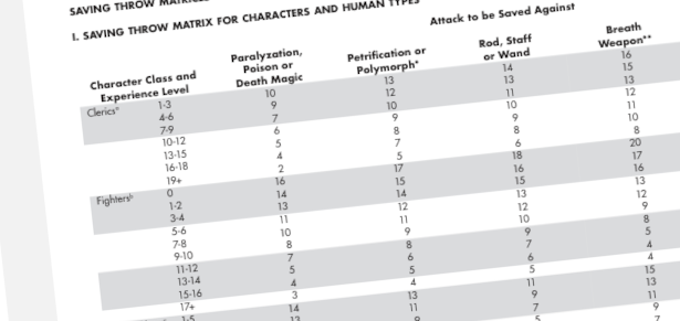I’ve often debated with people about why the save tables aren’t in the Player’s Handbook. My general reply is that they are a game mechanic and so fall under the purview of the DM. In retrospect, I don’t think that argument is solid enough… though it can be mitigated by the knowledge that the player will record the saves, as given by the DM, on his character sheet.